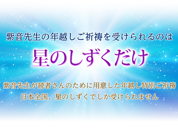 この度、新たな年を迎えるにあたり、心身にため込んだ旧年のネガティブを祓い(はらい)、あなたとご家族さまの健康と幸せな生活を祈願するため、紫音先生が特別に年越しお祓い(おはらい)のご祈祷を行います。
