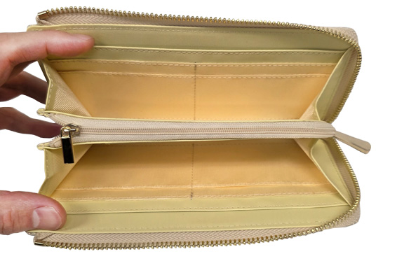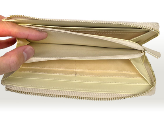 - お札と小銭を分けることもできますが、便利なのは小銭も入るファスナー付きのお財布。ファスナーもかさばらないようにすっきりとさせています。